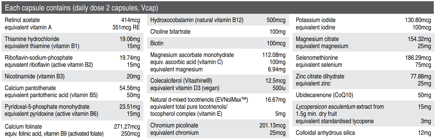 Provides only active forms of vitamins B2, B6, B12 and folate and is free from copper. This is an ultra-low excipient formula.